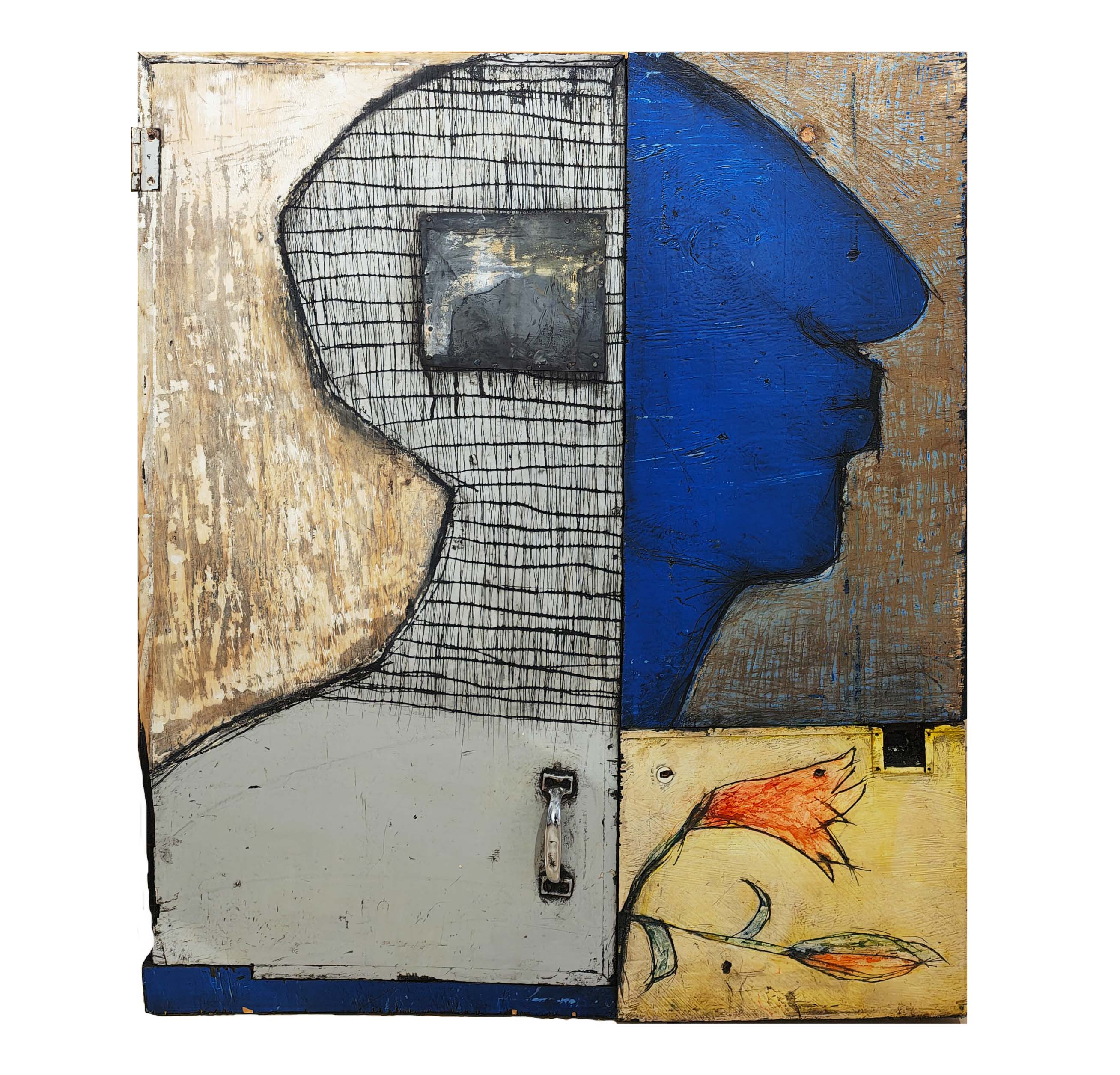 In the portrait series he has been consumed by these last four years, Eltayeb says he depicts the faces of the people he has encountered, past and present. Allured by old carpentry boxes and cabinet doors, each relic seems to stow untold stories and the lingering spirits of its former possessors. Adding minimalistic impressions upon these distressed tablets, either by painting or scraping at the wood, Eltayeb’s creative process complements his life story; He is engaged with a new life and the old. It is not by chance that Eltayeb’s artwork is about resurrection and the reincarnation of worn objects, all bearing hints of their former life.